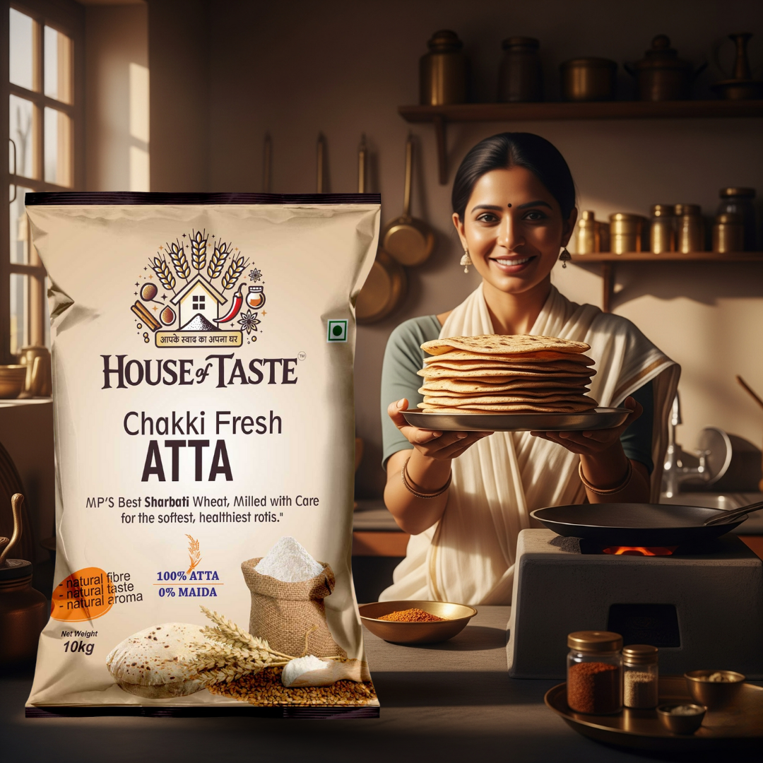 Experience the richness of traditional Indian rotis with House of Taste Chakki Atta. Made from 100% premium Sharbati wheat, this flour is stone-ground to retain maximum nutrition and freshness. The result? Soft, fluffy, and wholesome rotis that taste just like home.
